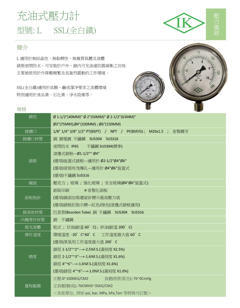 簡介 : L適用於無結晶性、無黏稠性、無雜質氣體及液體錶殼密閉防水, 可安裝於戶外, 錶內可充油達防震緩衝之功效, 主要